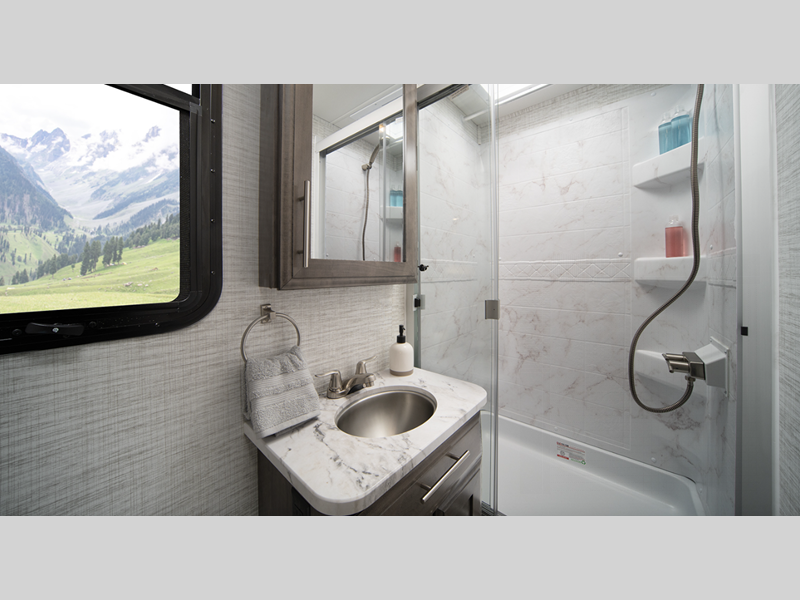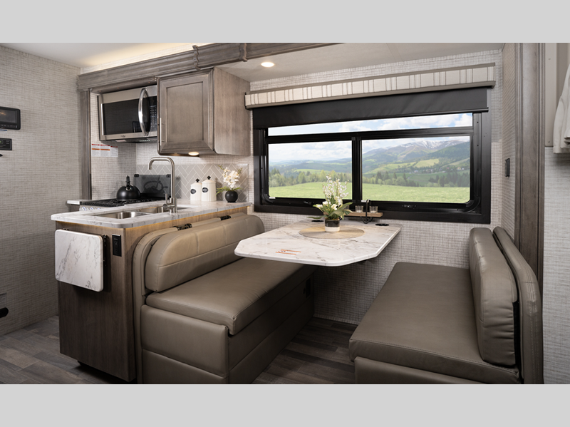Each model includes a new Winegard 2.0 Wi-Fi/4G antenna and an LED HD Smart TV in the living room to wash away those rainy day blues. The full-body paint options are sure to turn heads, and you'll love the panoramic window with a shade in the front cap. The interior will have you feeling right at home with LED-lit hardwood fascia, hardwood cabinet doors, frameless windows, and decorative kitchen backsplash.